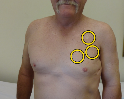 Yellow circles indicate locations of palpable lumps, which subsequently disappeared after vaccine treatment