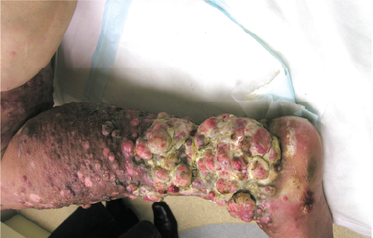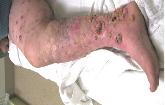 This woman had extensive bulky malignant melanoma metastases of the right leg. After treatment over a 4 month period, she had an almost complete regression of tumours. She lost kilograms of tumour from her leg using Cancuravax Vaccine Therapy alone, and could walk again.